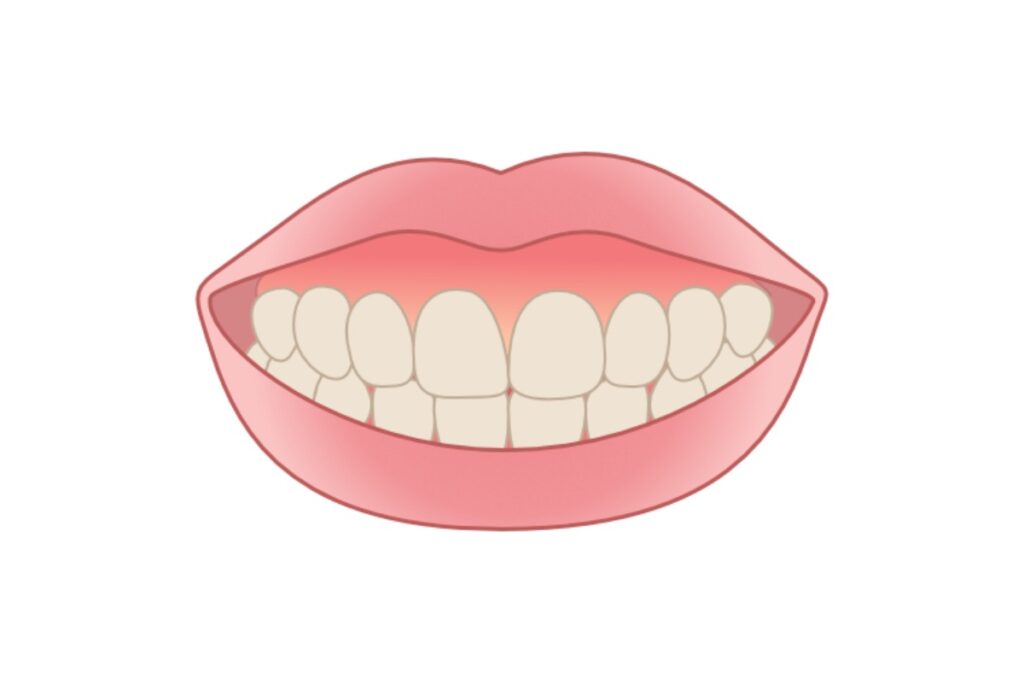過蓋咬合とは噛み合わせは深い状態のことです。画像のように、上の前歯が下の前歯に覆いかぶさる位置まできており、いーと噛んだときに下の歯が見えない状態です。