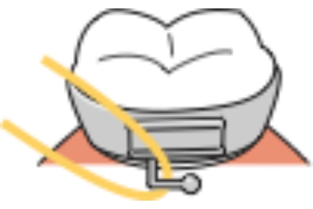 一般的にゴムが上下の歯を結ぶような形で装着し、歯と顎の動きを調節する役割をしています。治療の進行具合やその人の口腔内状況に応じて、ゴムの種類や取り付ける位置などが変わることがあります。
