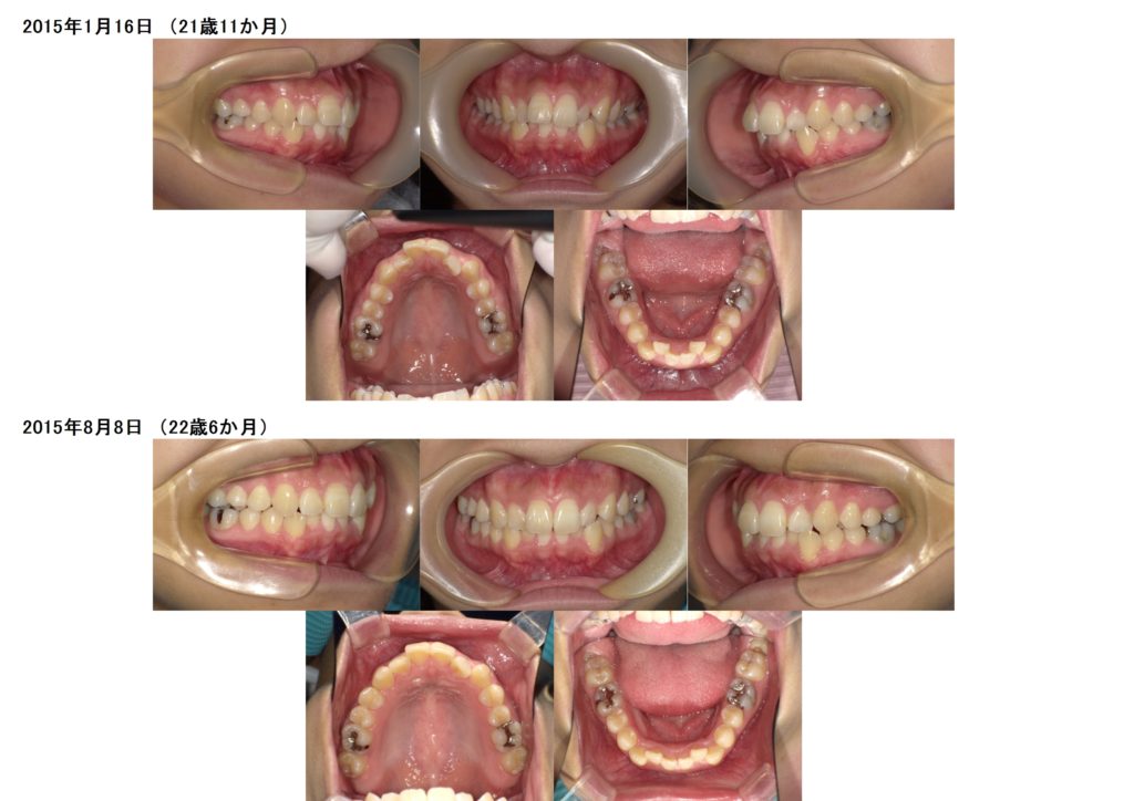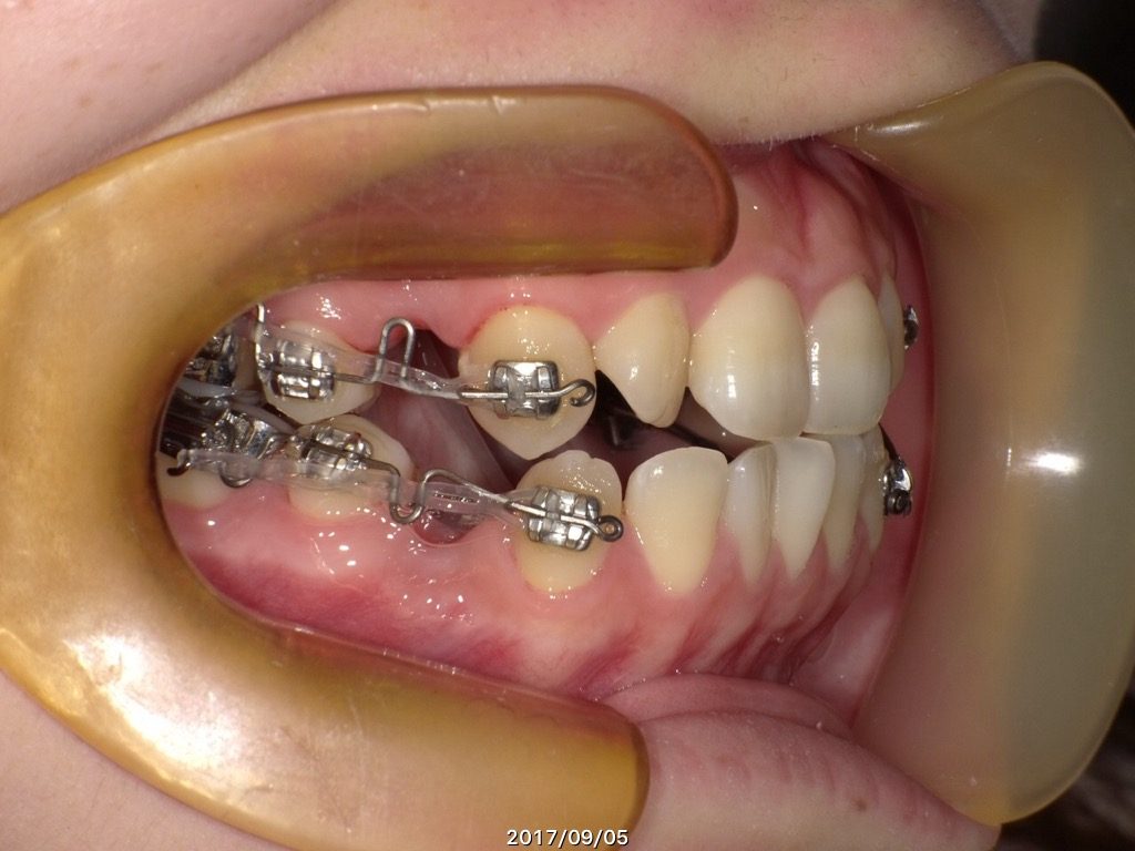 ↑上下4番目の歯を左右抜歯し、約半年間側面にブラケットを装着しました。
