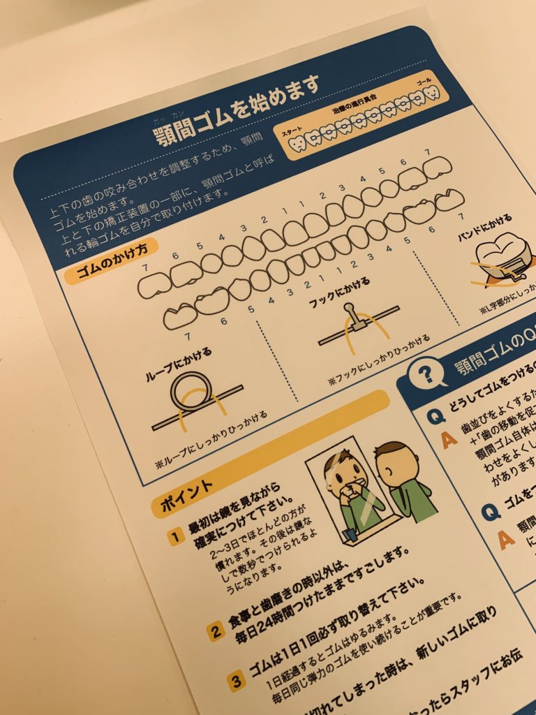 顎間ゴムが始まる患者様や、かける位置が変わる患者様には、部位を分かりやすくするために↓このようなプリントをお渡ししています