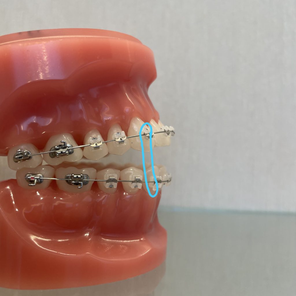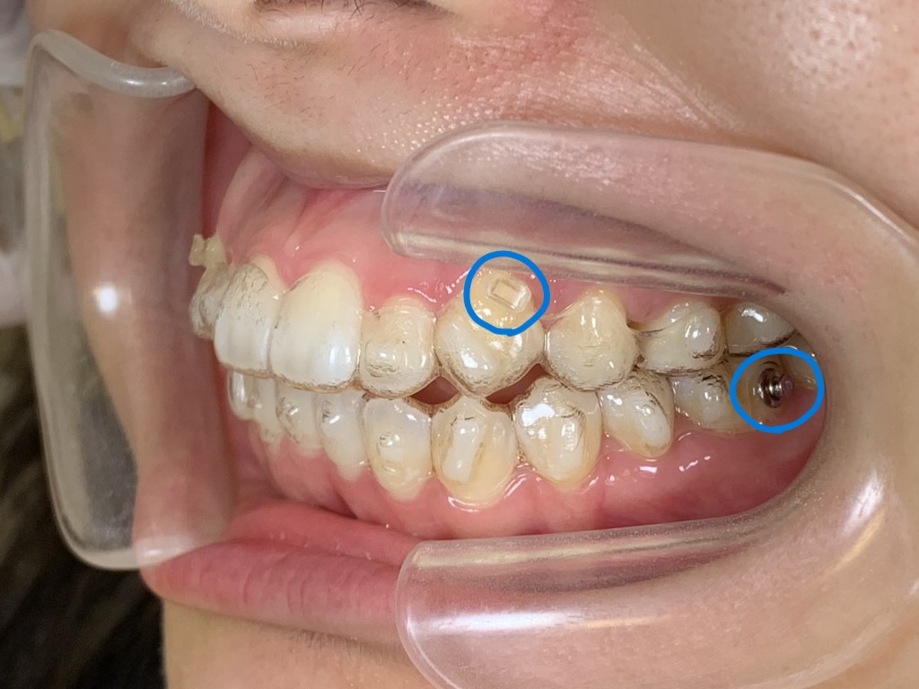 青丸で囲んだ部分に金具がついているの分かりますか?ボタンといわれる金具で、必要になったタイミングで歯の表面につけます。インビザラインのゴムかけはこの金具同士で引っかける場合が多いです🤔