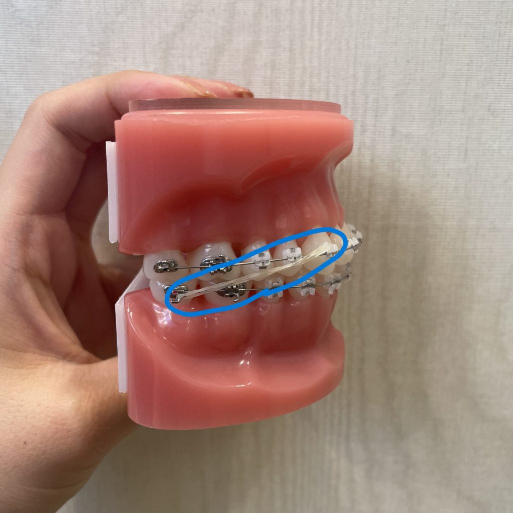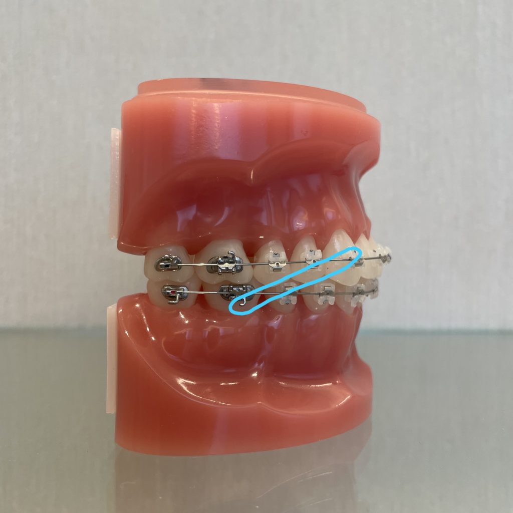 上の3番目の歯と下にの6番目の歯に引っかけ、そうすると上の歯が後ろへ引っ張られるように力が加わります。この後ろへ引っ張られる力を利用して、前に出ている歯を引っ込めよう、というわけです。一番ベーシックな掛け方なんじゃないかなと思います🙂