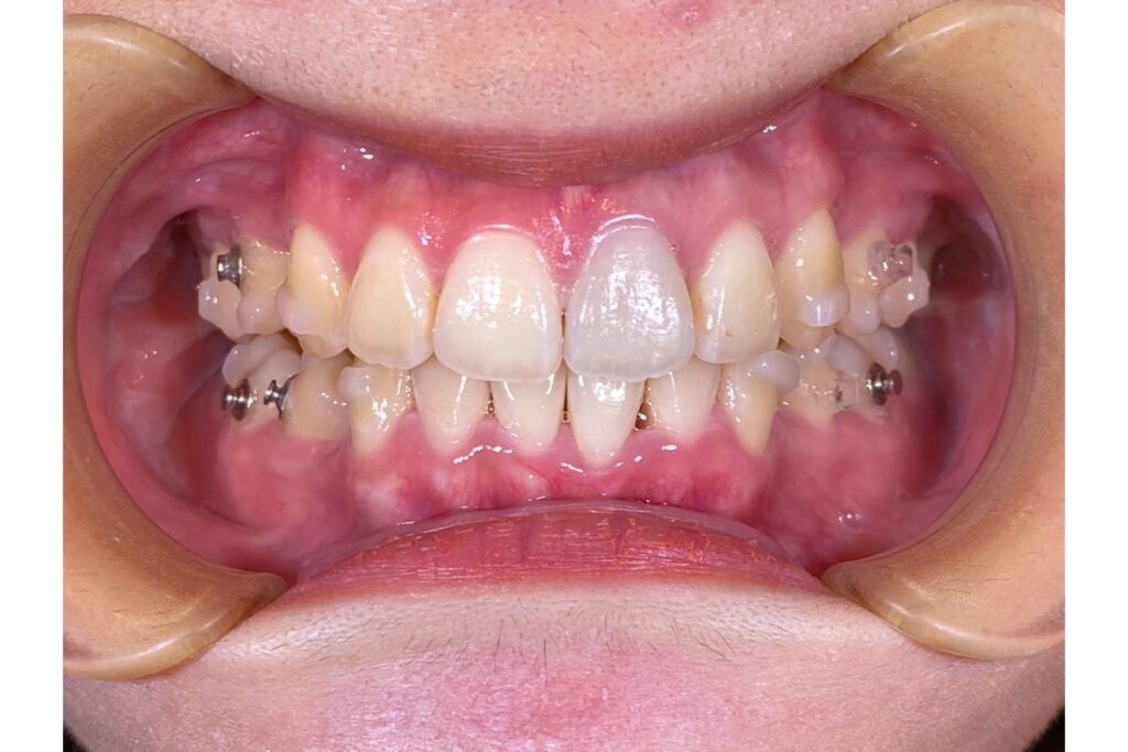 とにかく前歯の重なりを治したい!!とのことで治療を開始されました。加速装置を使用し約半年でここまで前歯の重なりを改善することができました。