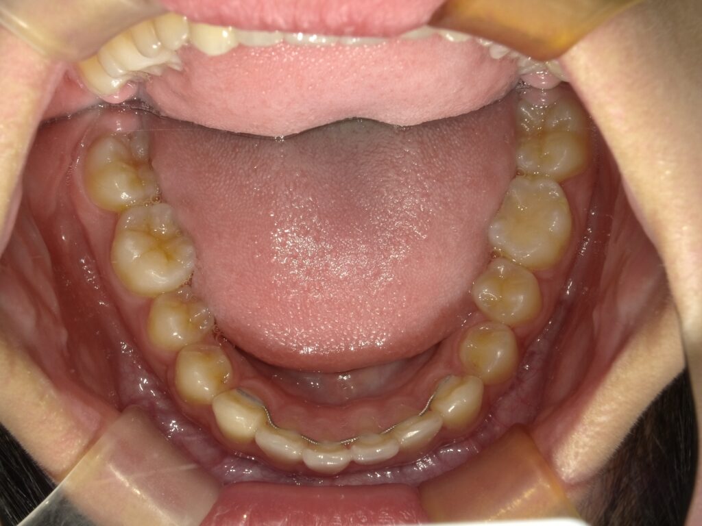 前歯の裏側に細いワイヤーを接着剤で固定するタイプ。取り外しはできません。