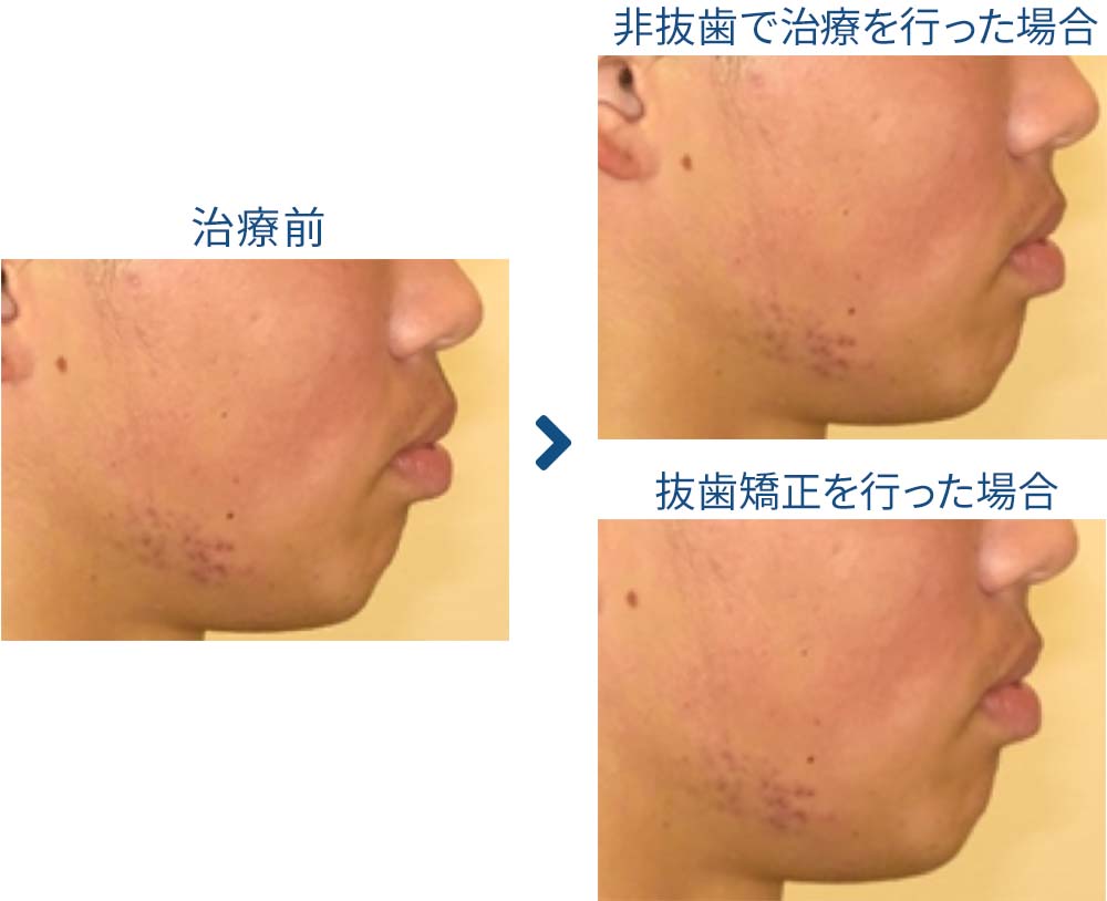などの理由で抜歯矯正を敬遠する方がいらっしゃいます。しかし、抜歯の回避と引き換えに、望まない治療結果を得てしまうことがあることを理解する必要があります。特に、口元(顔貌)の変化において大きな違いが生じることがあります。